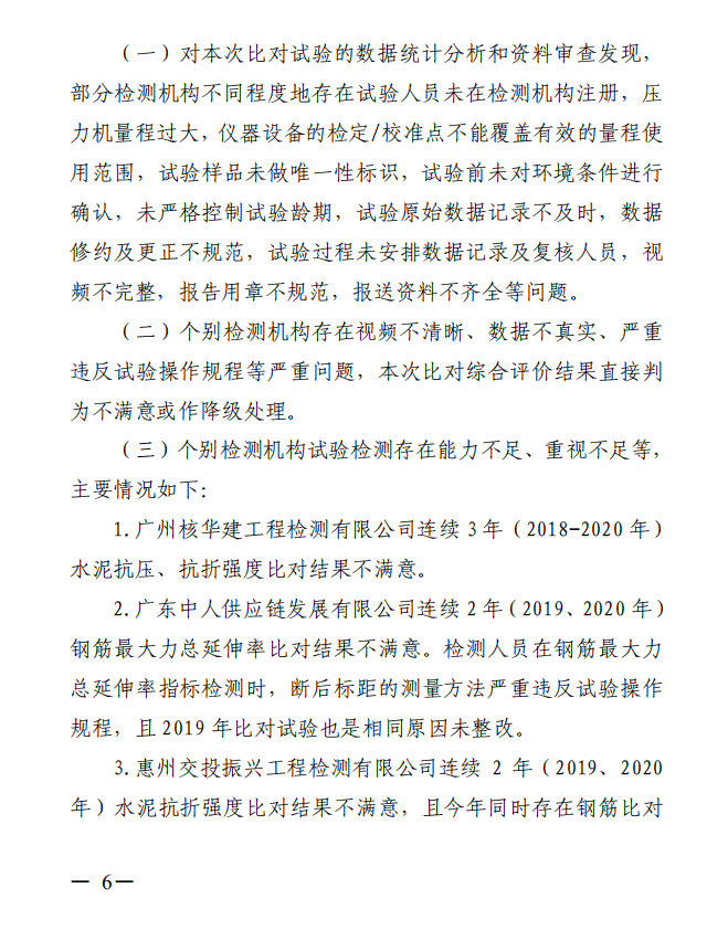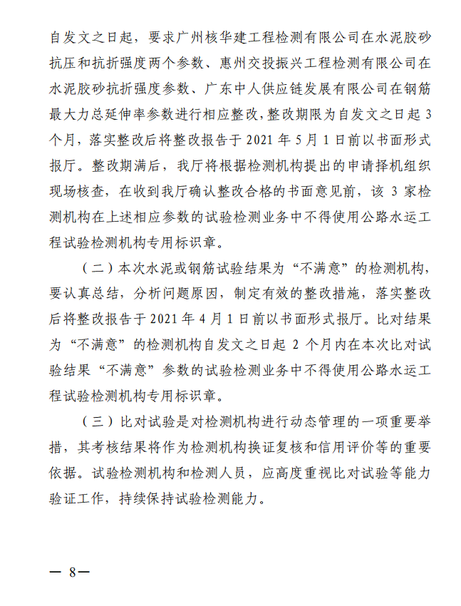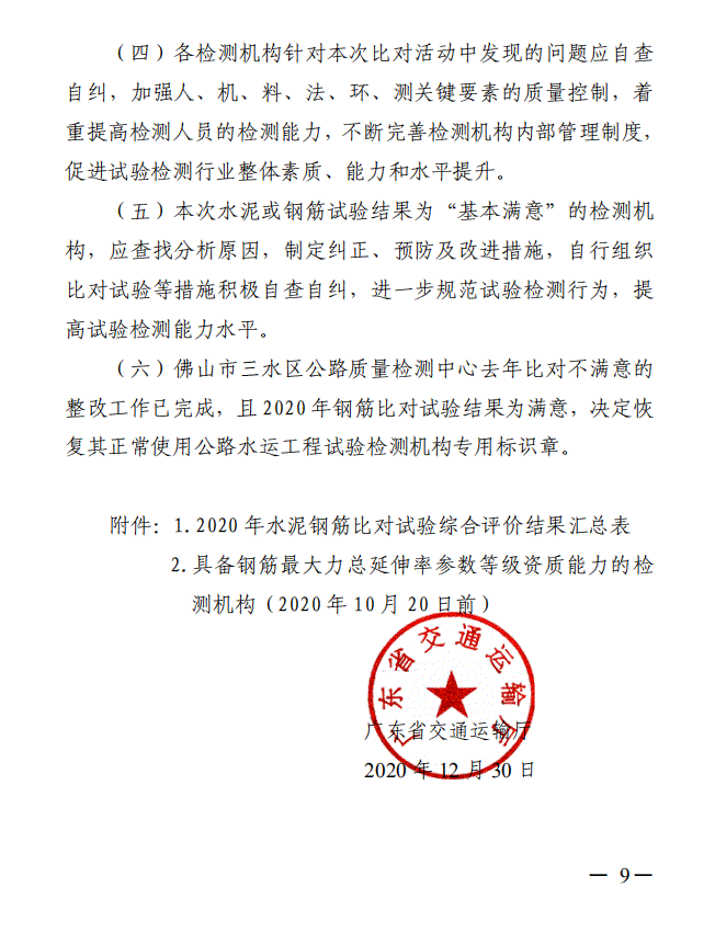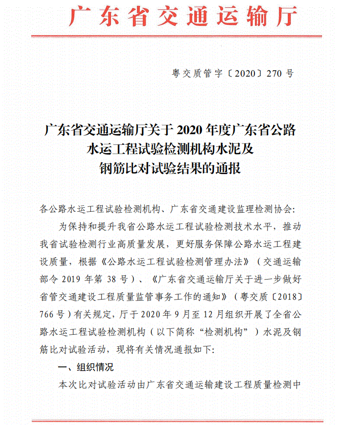 广东省交通运输厅关于2020年度广东省公路水运工程试验检测机构水泥及钢筋比对试验结果的通报
