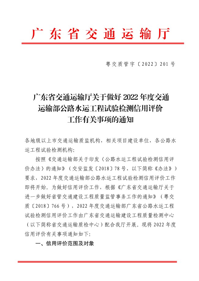 广东省交通运输厅关于做好2022年度交通运输部公路水运工程试验检测信用评价工作有关事项的通知