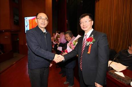图4:交通运输部总工程师周伟为我公司董事长陈少文荣获十大“交通建设监理领军人物”颁奖
