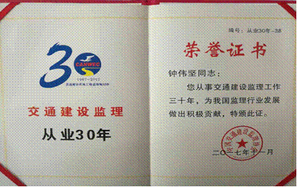 图10: 华路公司钟伟坚同志获评“交通建设监理从业30年”荣誉证书