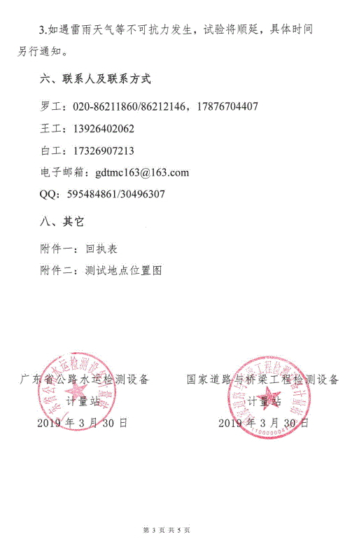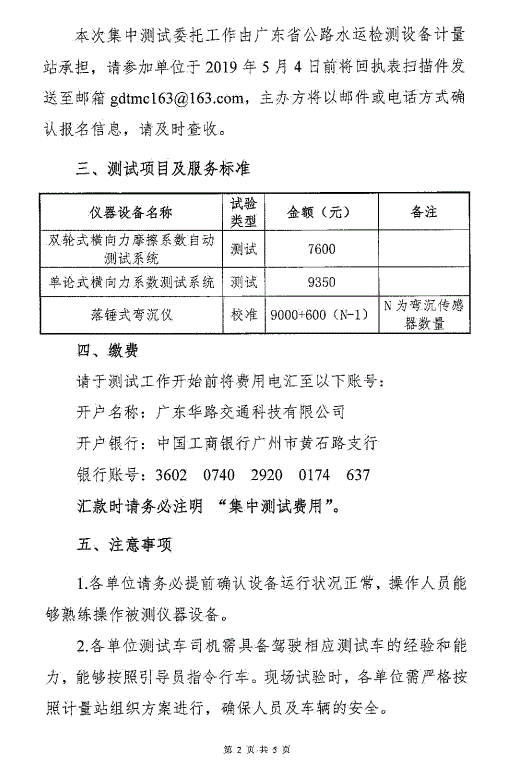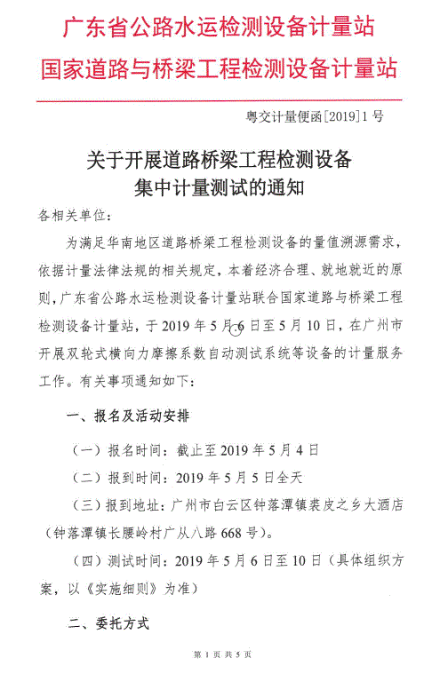 关于开展道路与桥梁工程检测设备集中计量测试的通知 粤交计量便函[2019]1号