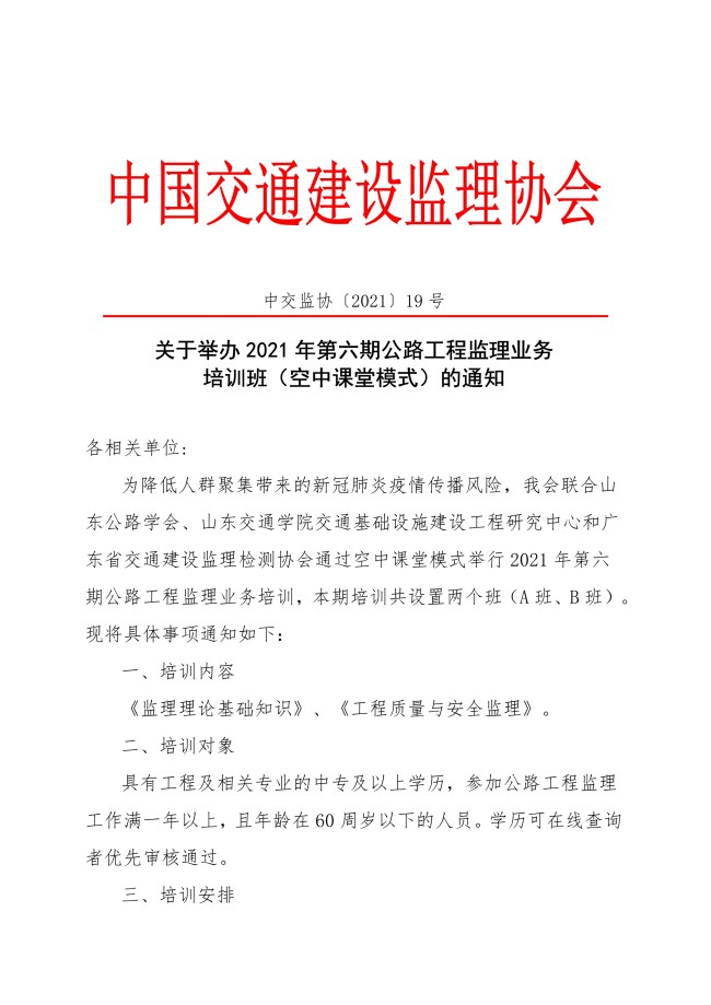 关于举办2021年第六期公路工程监理业务培训班(空中课堂模式)的通知