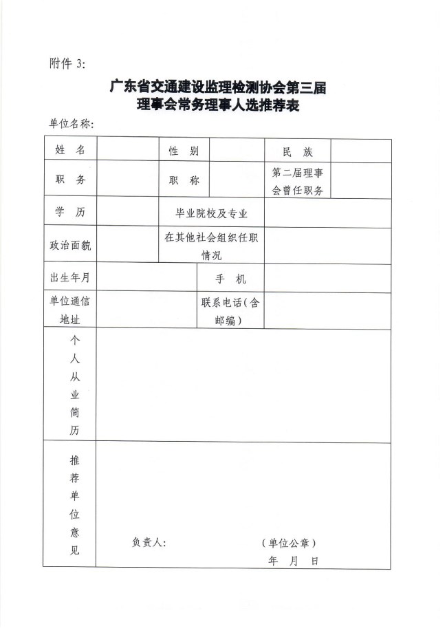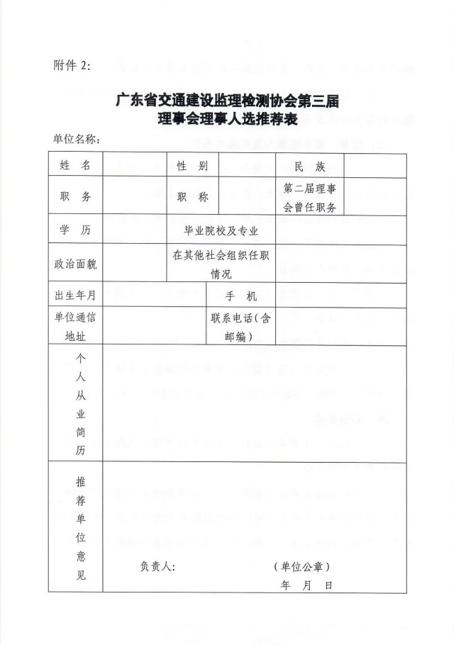 附件2:广东省交通建设监理检测协会第三届理事会理事人选推荐表.doc