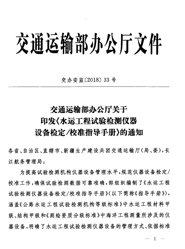 | 交办安监[2018]33号 交通运输部办公厅关于印发《水运工程试验检测仪器设备检定 校准指导手册 |
