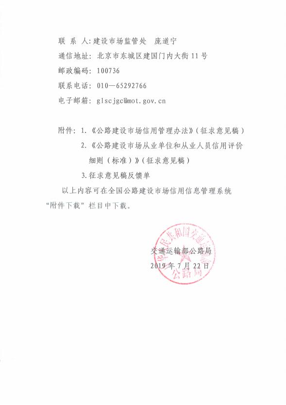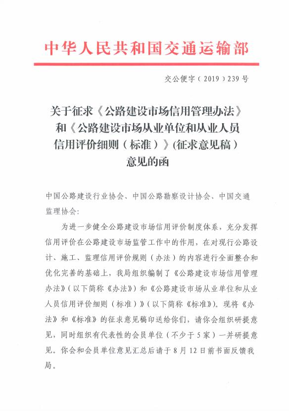 | 关于征求《公路建设市场信用管理办法》和《公路建设市场从业单位和从业人员信用评价细则(标准)》(征求意见稿)意见的函-(交公便字〔2019〕239号) |