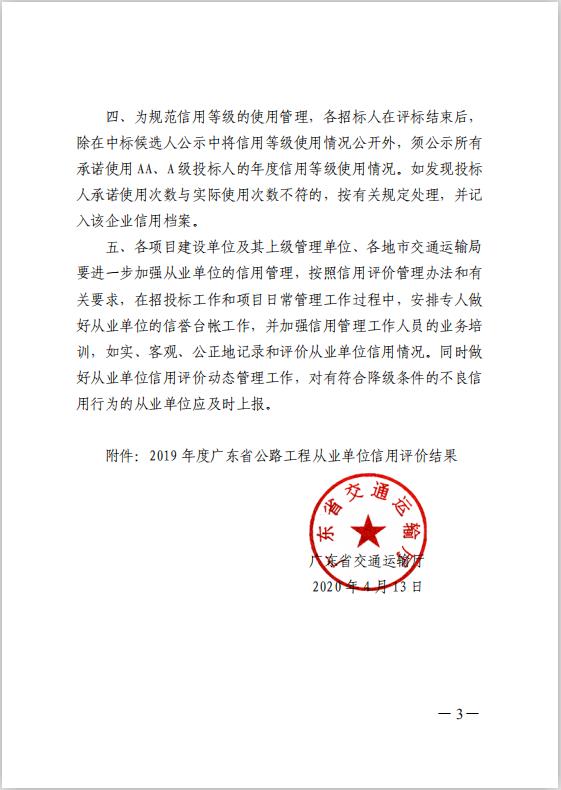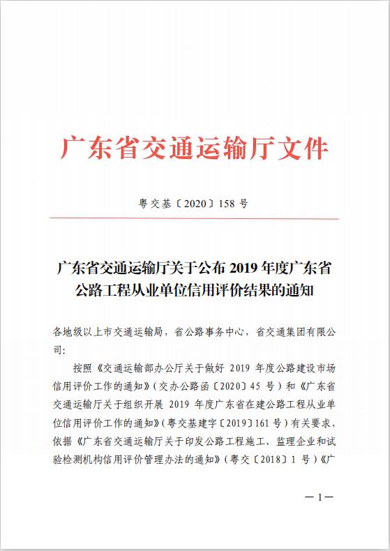 广东省交通运输厅关于公布2019年度广东省公路工程从业单位信用评价结果的通知