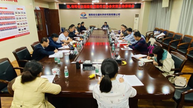 为学习湖南省交通建设监理协会及有关企业先进经验,增强粤湘两省行业协会的工作交流,探讨推动交通监理检测行业高质量发展工作,11月14-15日,由广东省交通建设监理检测协会陈少文理事长带队,协会副理事长徐革胜、梁光华,协会高级咨询专家谢灿文,秘书长吴益林及秘书处相关工作人员等组成的广东省交通建设监理检测协会交流访问团,专程由广州赴长沙对湖南省交通建设监理协会进行交流学习访问。 这次交流学习活动得到了湖南省交通建设监理协会的高度重视和热情接待,湖南省交通建设质量安全监督管理局彭祖祥副局长亲临会议指导,湖南省交通建设监理协会理事长李剑波、协会副理事长李军生、梁昕晔、秘书长夏明海及相关骨干企业负责人等出席了会议及相关活动。 广东协会交流访问团,先后参加了两省协会交流座谈会,对湖南发展形势及相关重点企业等进行了参观考察与交流。 在双边交流座谈中,粤、湘两省行业协会分别介绍了各自协会的工作情况,并围绕协会加快发展、机构与制度建设、会员状况及业务开展、协会作用发挥、取得的经验及做法、存在问题及今后工作方向等方面,进行了深入的互动交流和热烈研讨,对当前行业面临的形势、监理取费、人员配备、加强自身建设、推进高质量发展等共同关心的问题开展了重点讨论。
