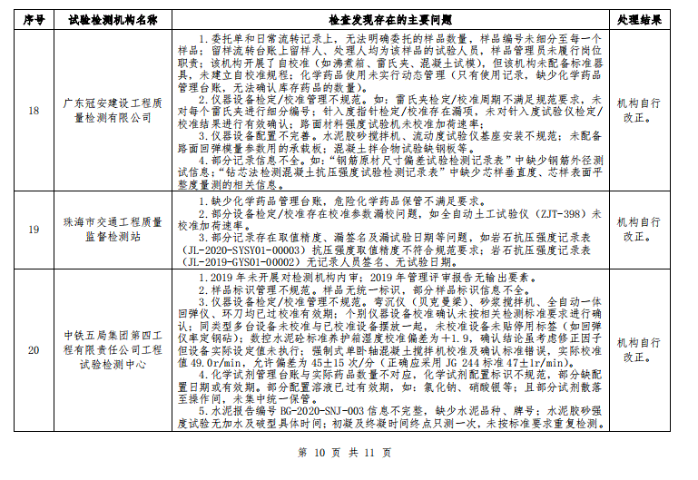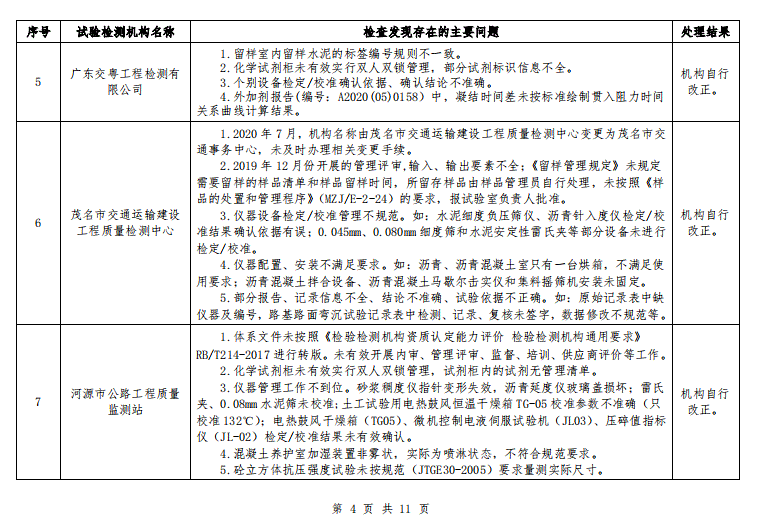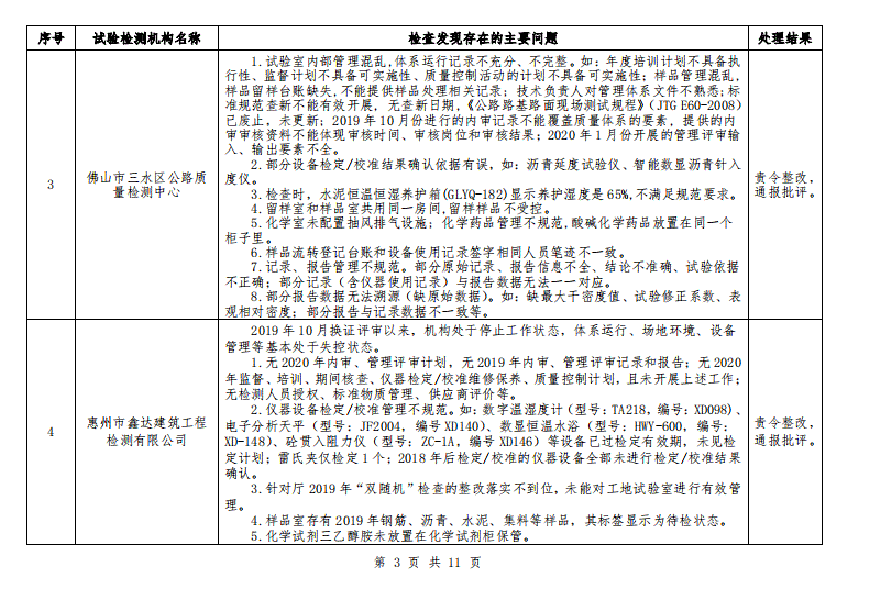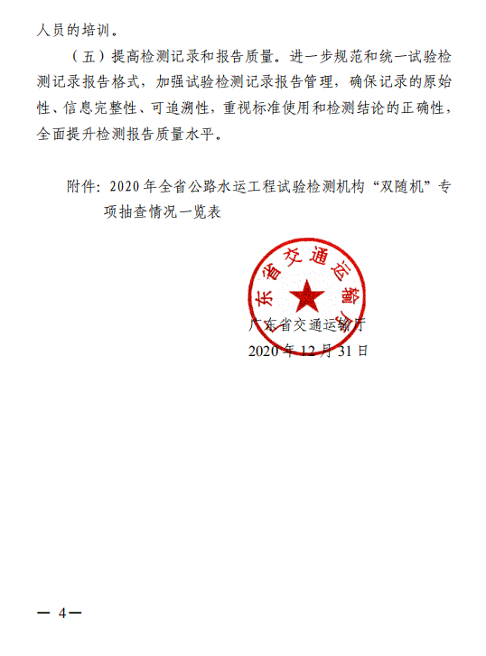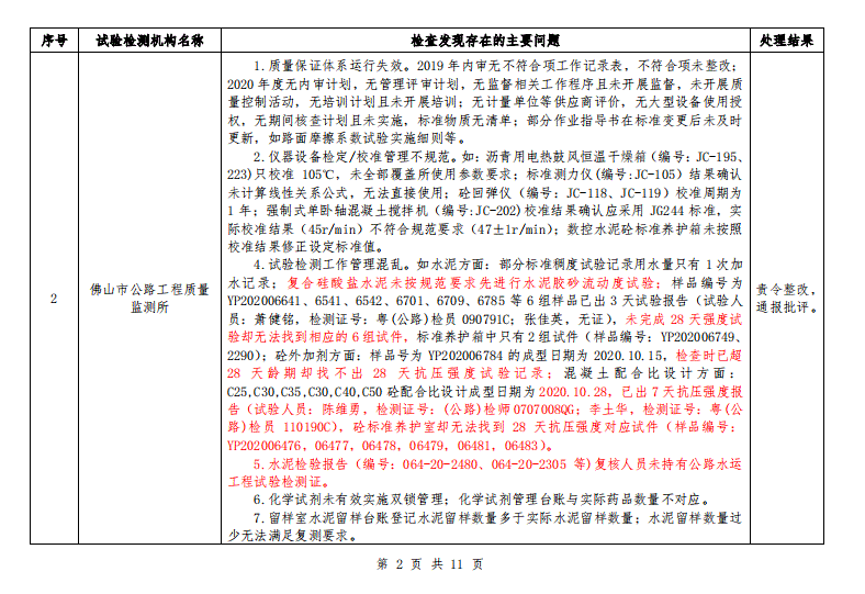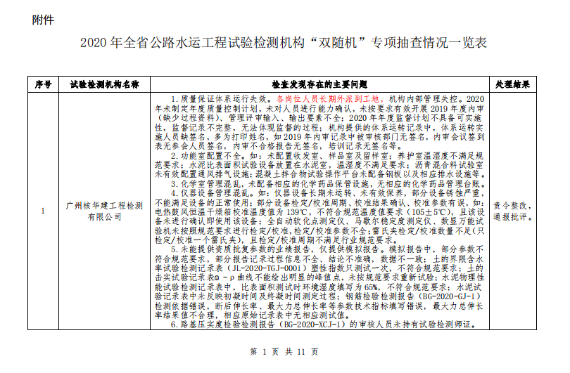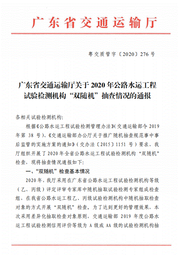 广东省交通运输厅关于 2020 年公路水运工程试验检测机构“双随机”抽查情况的通报