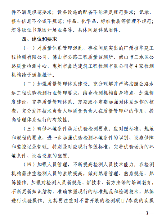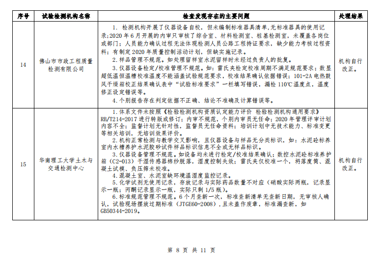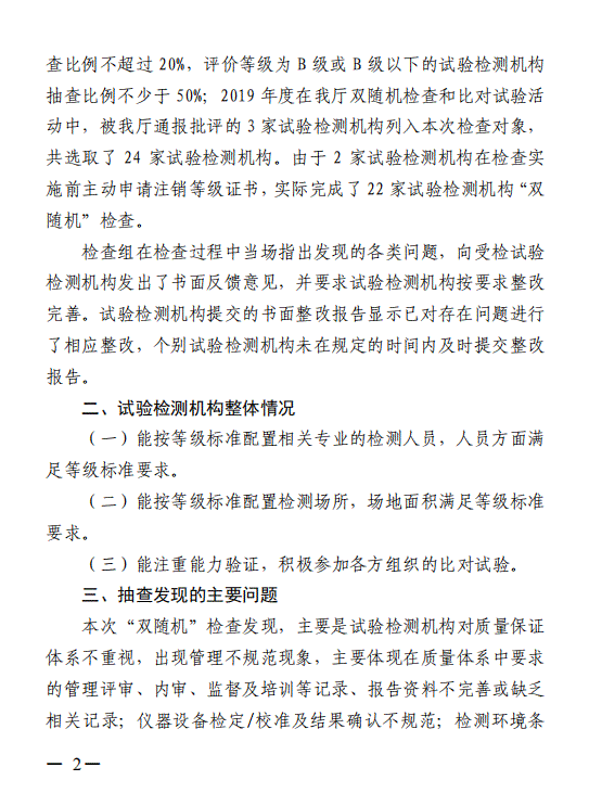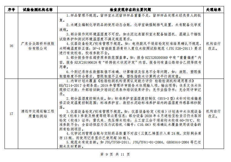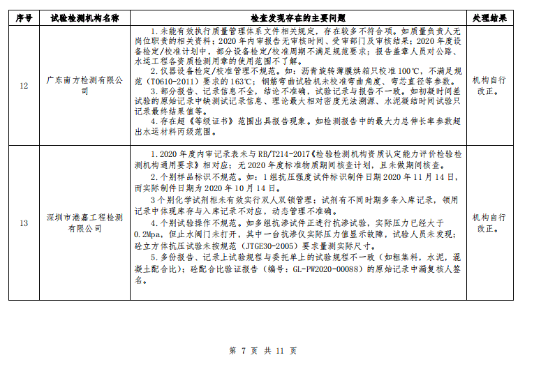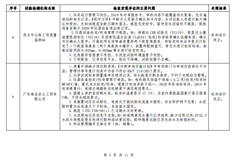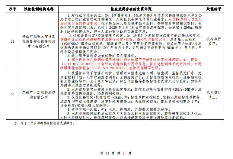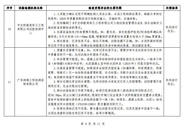 广东省交通运输厅关于 2020 年公路水运工程试验检测机构“双随机”抽查情况的通报