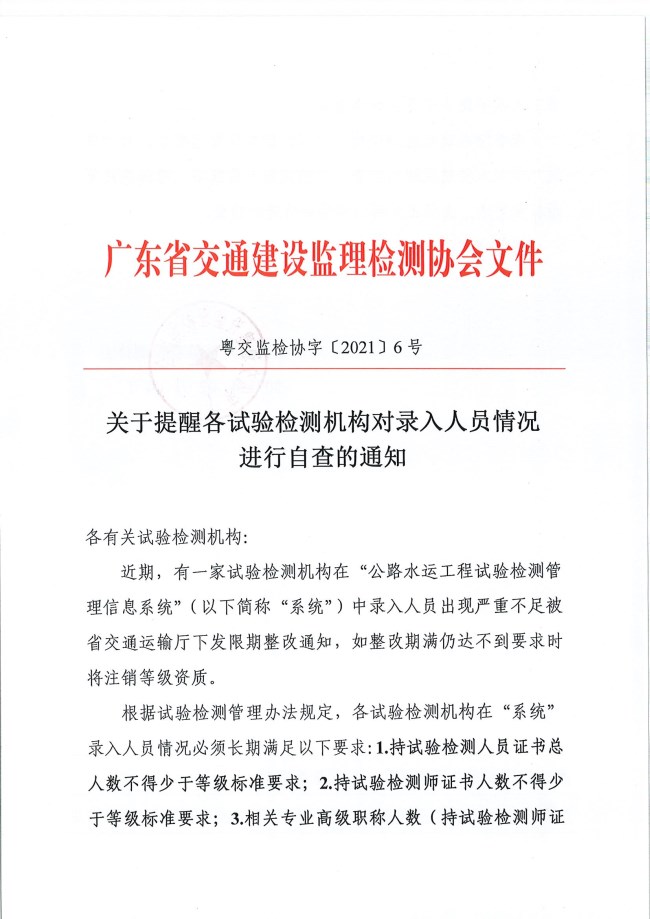 关于提醒各试验检测机构对录入人员情况进行自查的通知