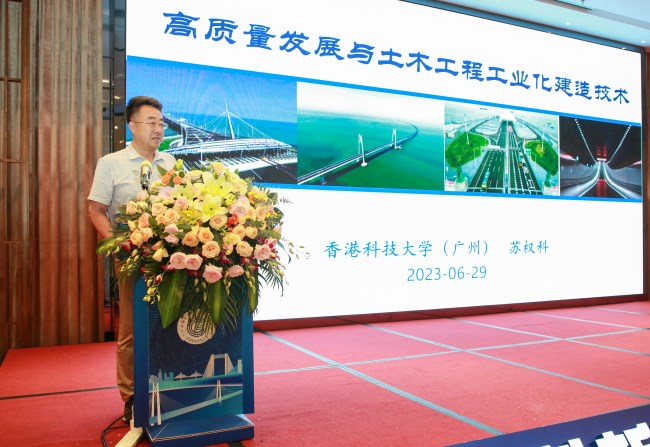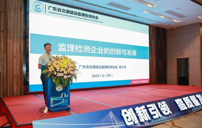 苏权科教授作《高质量发展与土木工程工业化建造技术》主题报告 香港科技大学(广州)系统枢纽智能交通学域教授,科技领创中心首席工程师苏权科作《高质量发展与土木工程工业化建造技术》主题报告。苏教授就港珠澳大桥建设过程中对工程技术、材料装备、寿命保障、工程管理、安全运营及绿色环保等系列问题的攻关成果及跨海集群工程工业化建造技术体系进行阐释。他表示,工业化建造模式是超大体量现代交通基础设施建设的主流趋势,是交通强国建设的重要支撑。通过对该技术体系的探索与实践,实现对质量安全、生态环保与工程建设、项目运营之间关系的进一步平衡,进一步推动我国超大体量现代交通基础设施建设水平与工程品质的提升。 陈少文理事长作《监理检测企业的创新与发展》主题报告 广东省交通建设监理检测协会理事长、教授级高级工程师陈少文作《监理检测企业的创新与发展》主题报告。他从推动行业创新及高质量发展的意义、当前行业面临的问题及挑战、监理的改革及转型发展、检测的做强做大及创新发展进行分析,阐述了监理检测企业怎样做强和创新发展、融合发展,提出了创新转型发展的路径。他表示,监理检测企业要重视战略思维和发展谋划,加强企业文化建设和人才引领、创新团队打造,强化数字化、智能化技术应用,彰显优秀企业家精神,持续提升监理检测企业的核心优势及服务能力,进而更好推进企业及行业的高质量发展。 随后九个交流分享报告陆续进行: 广州诚信公路建设监理咨询有限公司市场合约部副经理、高级工程师郭振欣作《走出监理智慧路》交流分享