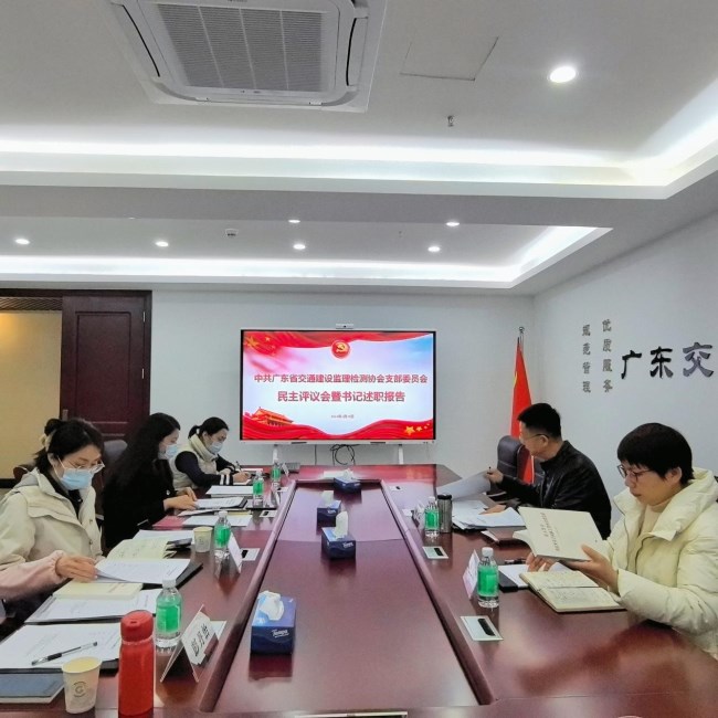 协会召开党支部民主评议会暨 书记述职报告会议 2024年1月30日,协会在云山金谷协会会议室召开中共广东省交通建设监理检测协会支部委员会党员民主评议暨书记述职报告会员。会议由协会支部书记陈少文理事长主持,支部全体党员参加会议、秘书处专职人员列席会议。